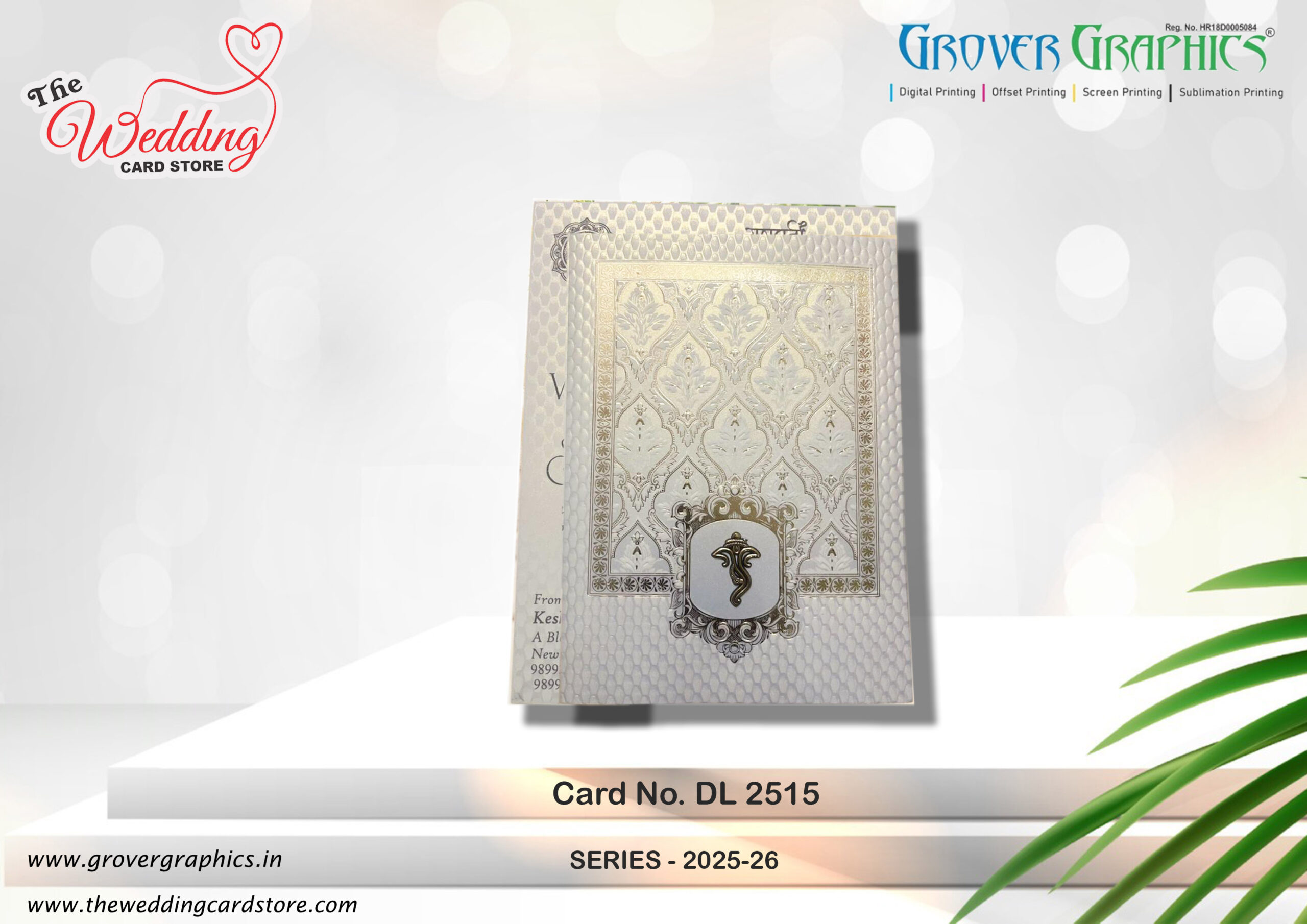 The card design is a white and gold-toned wedding invitation card, featuring a central Ganesha motif and intricate patterns.