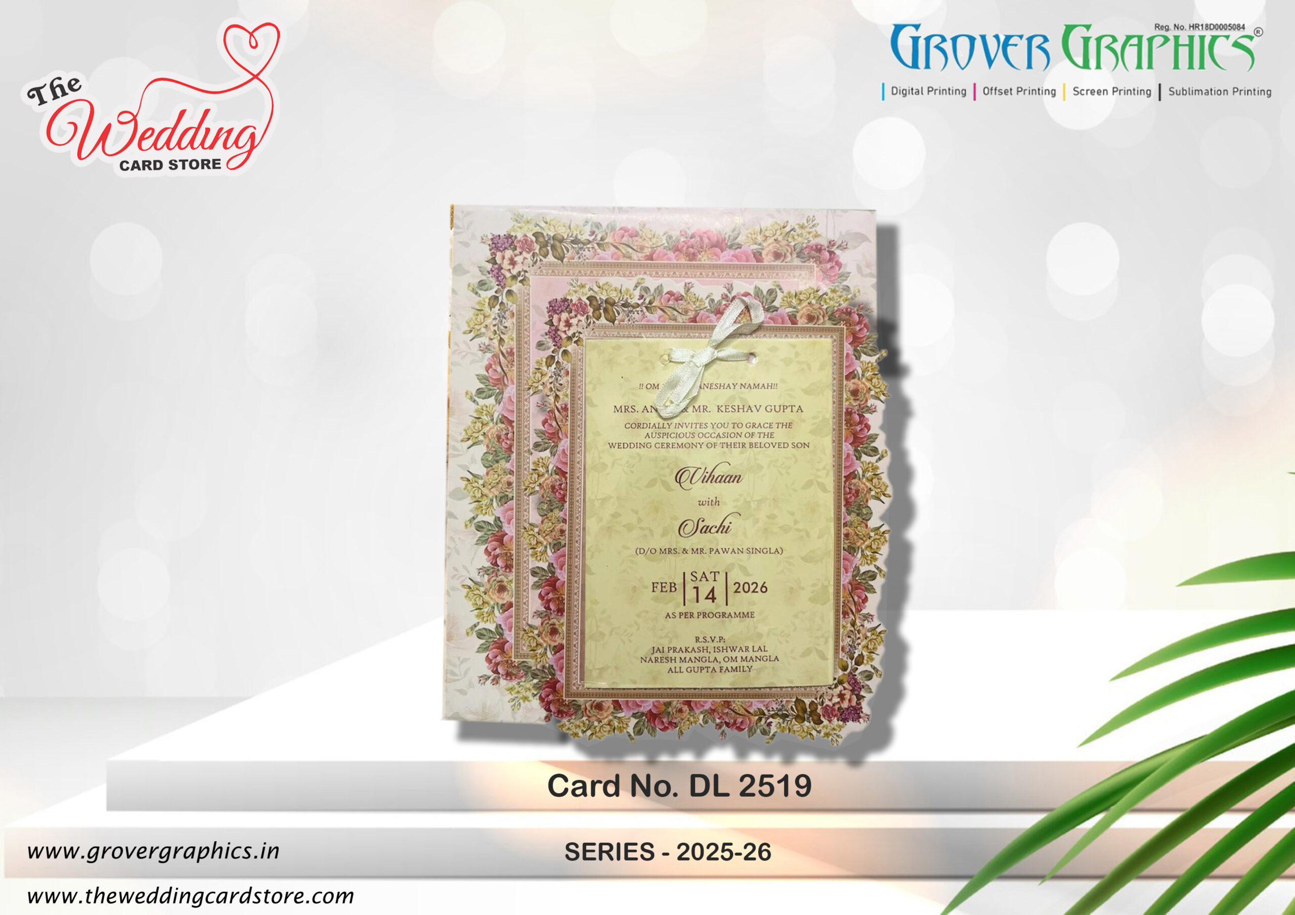 The card features a prominent floral theme with a multi-color print, including shades of pink, green, and cream, creating an elegant and festive appearance.