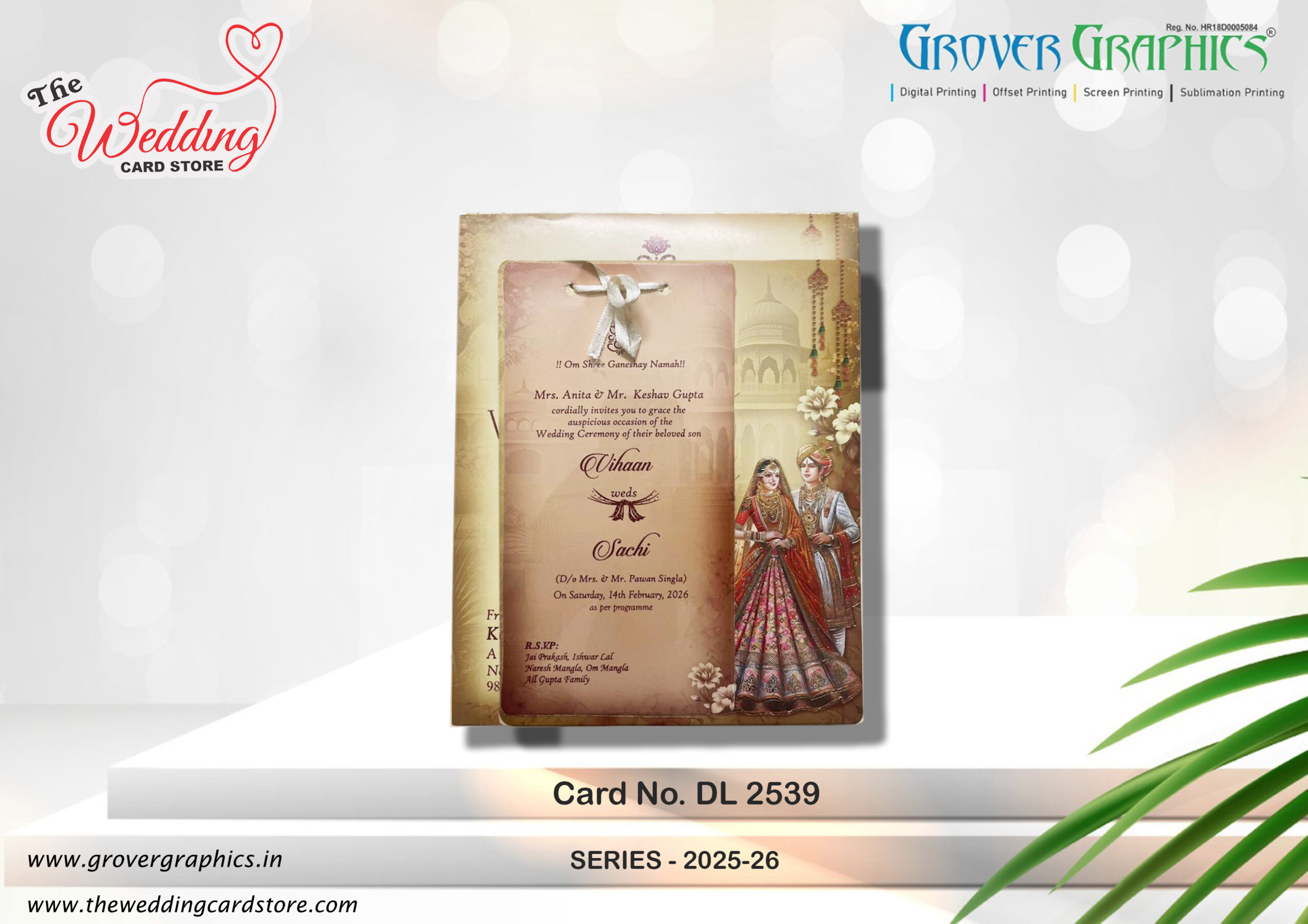 Elegant and traditional Indian aesthetic, combining classic motifs with modern presentation.The card showcases a central ivory-colored panel with floral accents and a decorative ribbon, accompanied by detailed illustrations of a bride and groom in traditional attire, set against a subtle background inspired by Indian architecture and cultural elements.