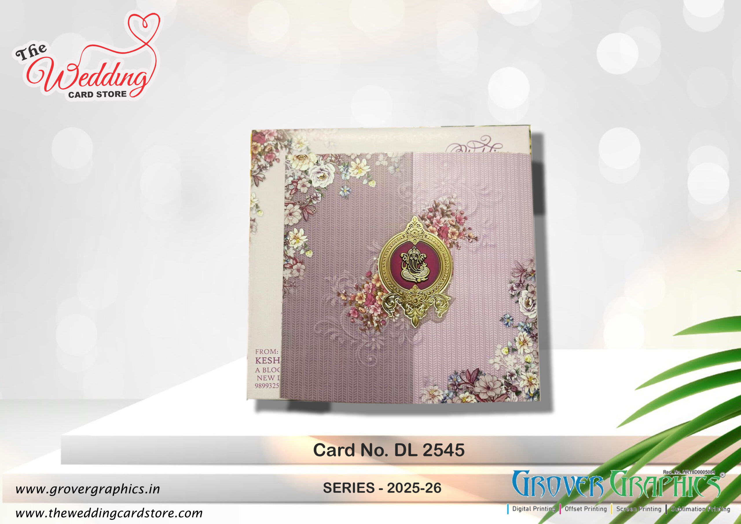 The card design features an elegant floral motif with pastel shades and a sophisticated texture. The centerpiece is a gold embossed emblem with a Ganesh symbol, set against a soft mauve-pink background adorned with delicate flowers