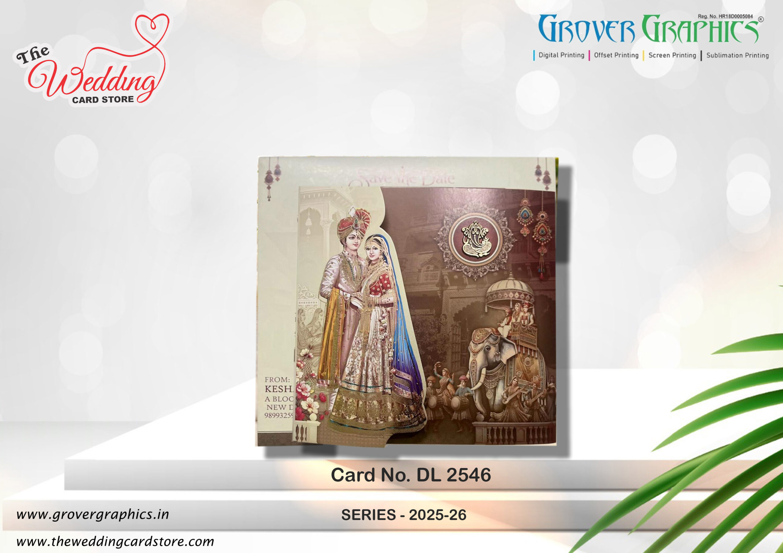 The central image features a bride and groom dressed in ornate wedding attire, standing together in a regal pose, which symbolizes their union in a traditional Indian wedding ceremony. The couple is illustrated in intricate detail with embroidered and bejeweled garments.