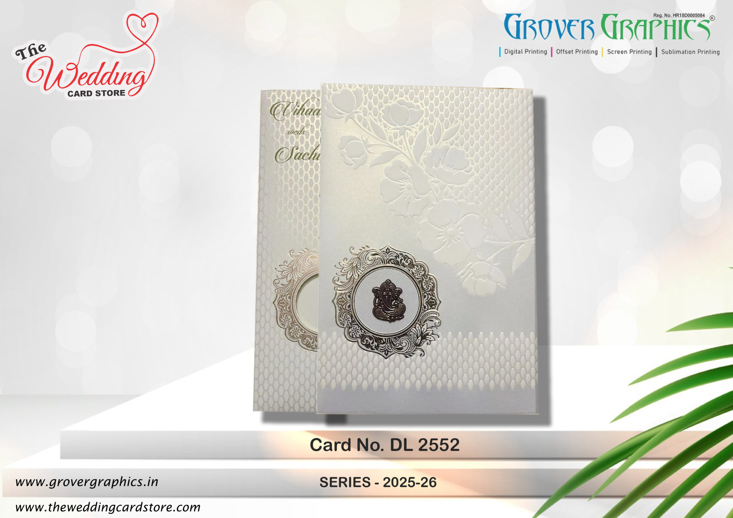 The card design shown in the image is an elegant and traditional invitation card, likely intended for a wedding. The card features a sophisticated embossed floral pattern throughout, with a soft, creamy white and light silver color scheme giving it a classic and luxurious appearance