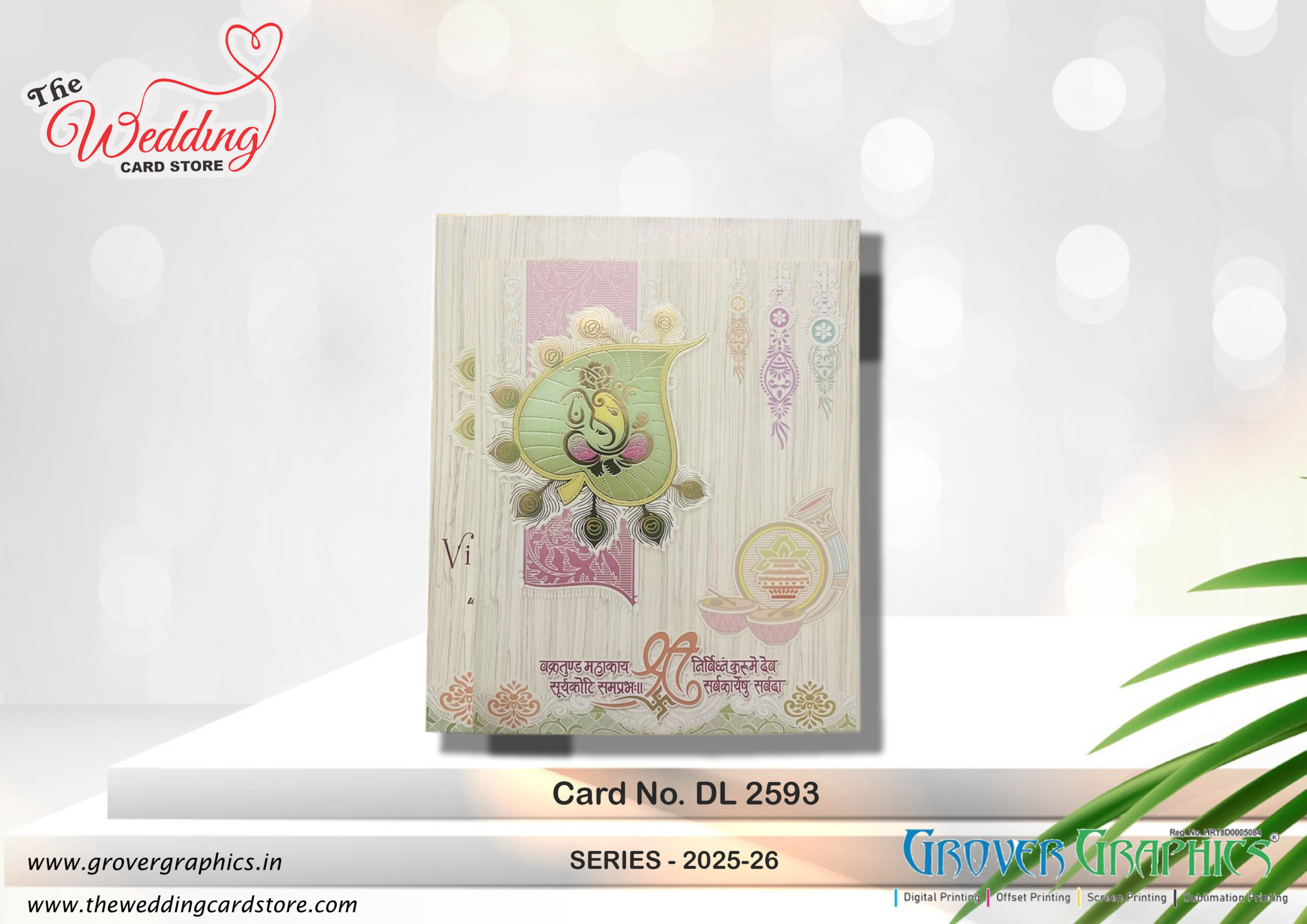 The card features a pastel wooden-texture background with intricate embossed motifs and religious symbols. At the center, there is a large floral and leaf design blending pastel shades of green, gold, and pink, with an elegant Ganesh motif—a common symbol of auspicious beginnings in Hindu weddings.